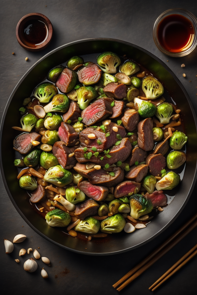 47. Beef and Brussels Sprouts Stir Fry: Beef sirloin, Brussels sprouts, onion, garlic, soy sauce, cornstarch.
