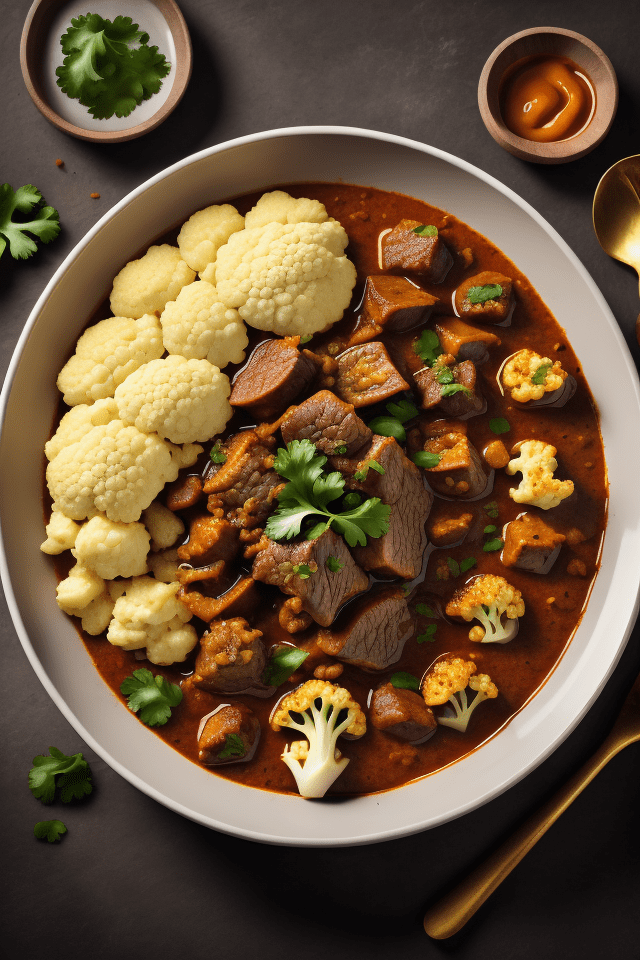 46. Beef and Cauliflower Curry: Beef sirloin, cauliflower, onion, garlic, coconut milk, curry powder.