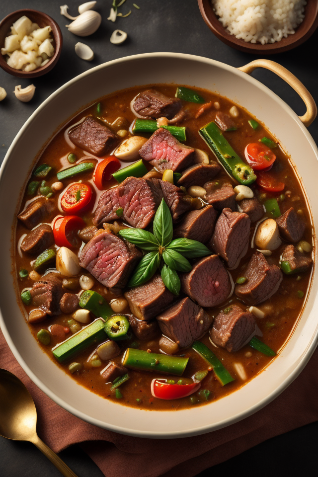 48. Beef and Okra Gumbo: Beef chuck, okra, onion, garlic, canned tomatoes, beef broth.