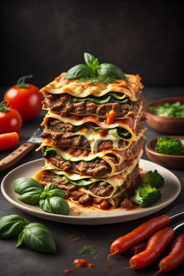 42. Beef and Vegetable Lasagna: Ground beef, lasagna noodles, mixed vegetables, tomato sauce, ricotta cheese, mozzarella cheese.