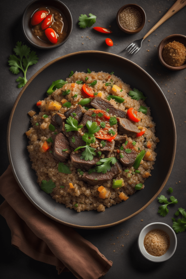 43. Beef and Quinoa Pilaf: Beef sirloin, quinoa, onion, garlic, beef broth.