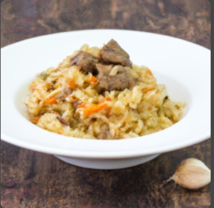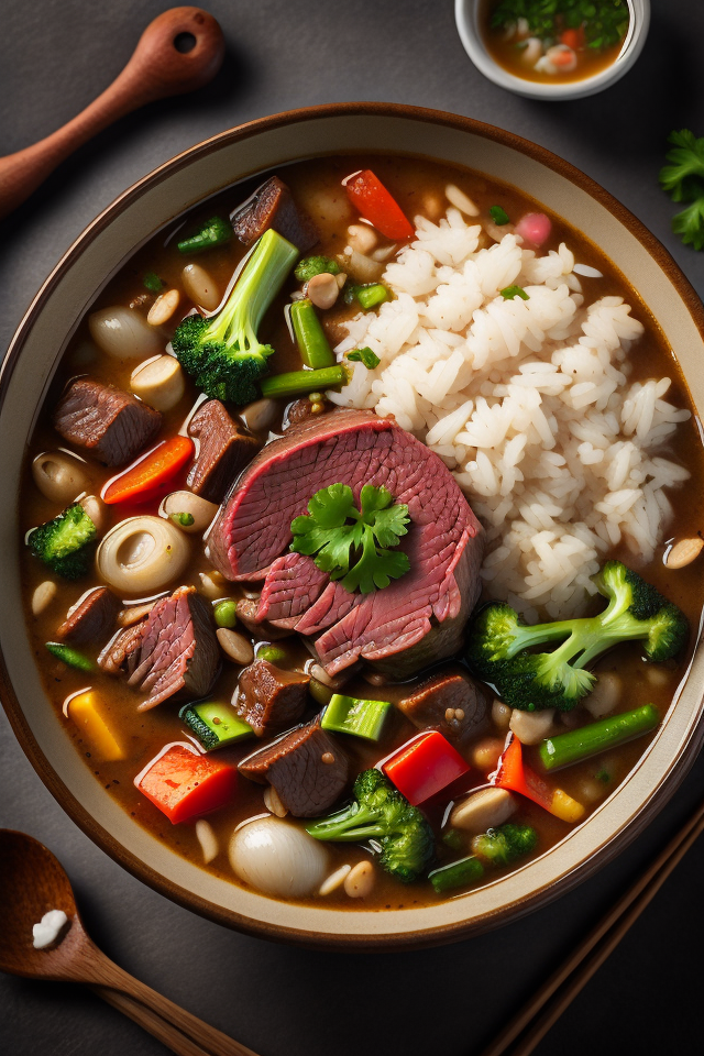 49. Beef and Rice Soup: Beef chuck, rice, mixed vegetables, onion, garlic, beef broth.