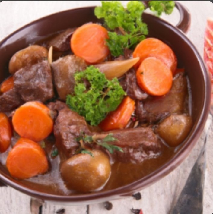 2. Beef Bourguignon: Beef chuck, mushrooms, carrots, onions, garlic, beef broth, red wine, flour, tomato paste, thyme.