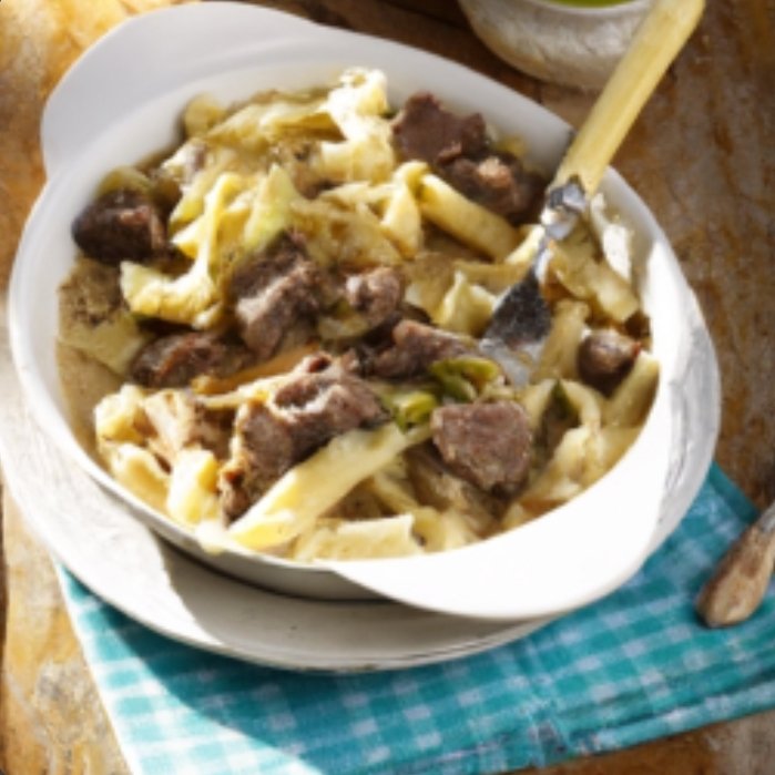 93. Beef and Mushroom Noodle Soup: Beef chuck, mushrooms, egg noodles, onion,