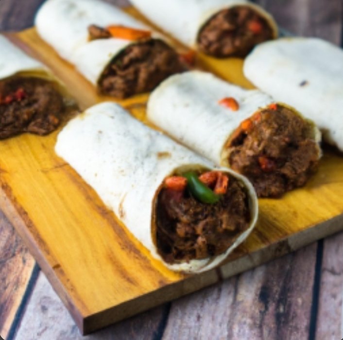 13. Beef and Bean Burritos: Ground beef, beans, tortillas, cheese, tomato sauce, onion, garlic.