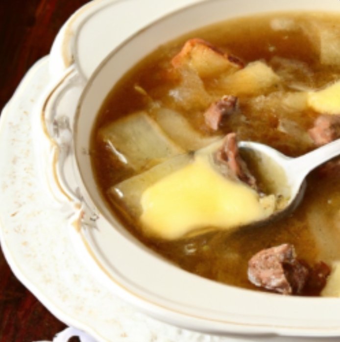 14. French Onion Soup: Beef broth, onions, garlic, butter, bread, Gruyere cheese.
