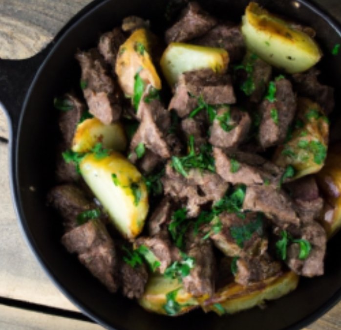 15. Beef and Potato Skillet: Ground beef, potatoes, onion, garlic, tomato sauce, beef broth.