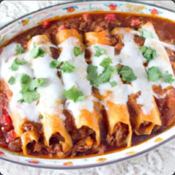 17. Beef Enchiladas: Ground beef, tortillas, cheese, tomato sauce, onion, garlic, chili powder.