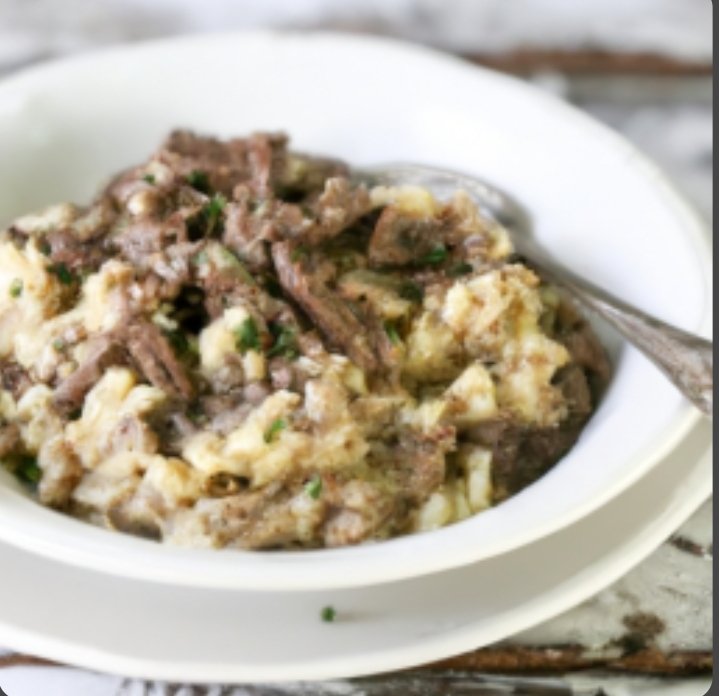57. Beef and Egg Noodle Casserole: Beef sirloin, egg noodles, cream of mushroom soup, onion, garlic.