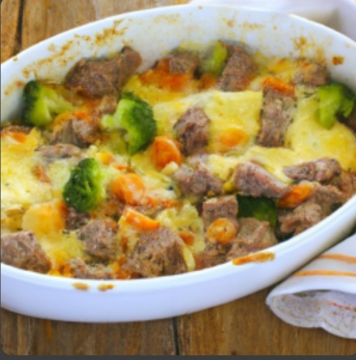 31. Beef and Broccoli Casserole: Beef sirloin, broccoli, rice, cream of mushroom soup, onion, garlic.