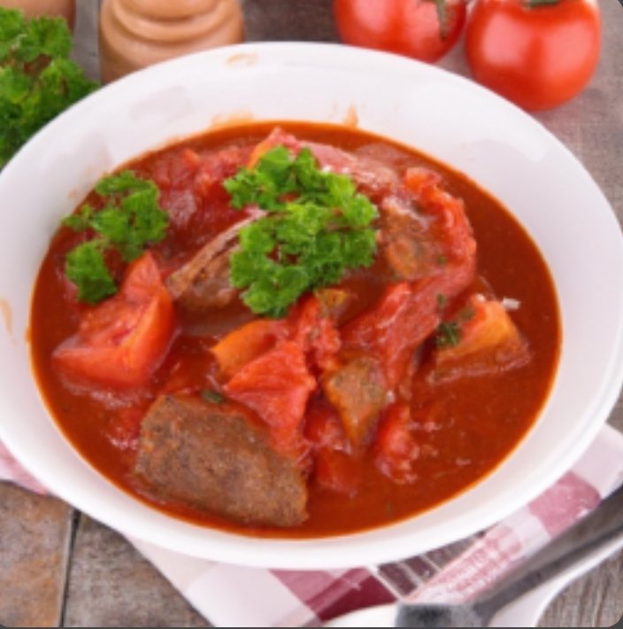 79. Beef and Fresh Tomato Soup: Beef chuck, fresh tomatoes, onion, garlic, beef broth, cream.