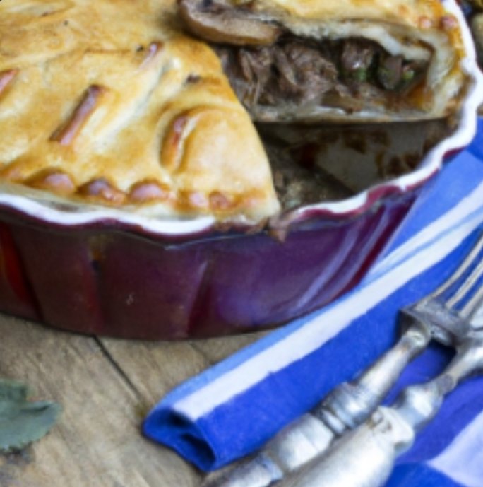 35. Beef and Mushroom Pie: Beef sirloin, mushrooms, onion, garlic, beef broth, flour, puff pastry.
