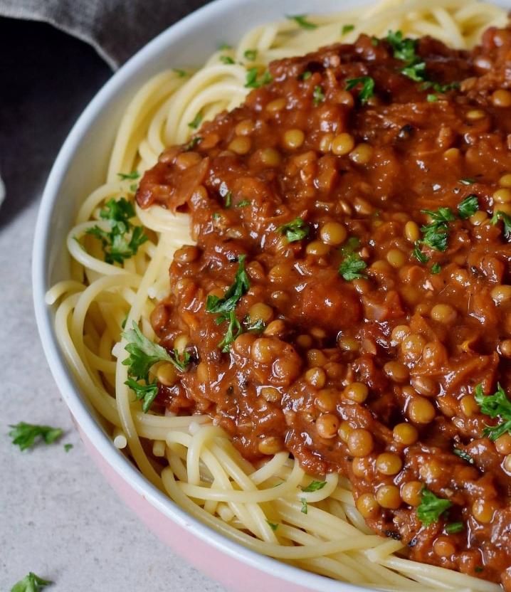 - Serve the lentil Bolognese sauce over cooked spaghetti or your preferred pasta.