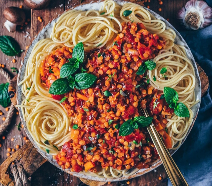 This vegan twist on the classic Bolognese sauce replaces meat with lentils for a hearty and satisfying pasta dish.